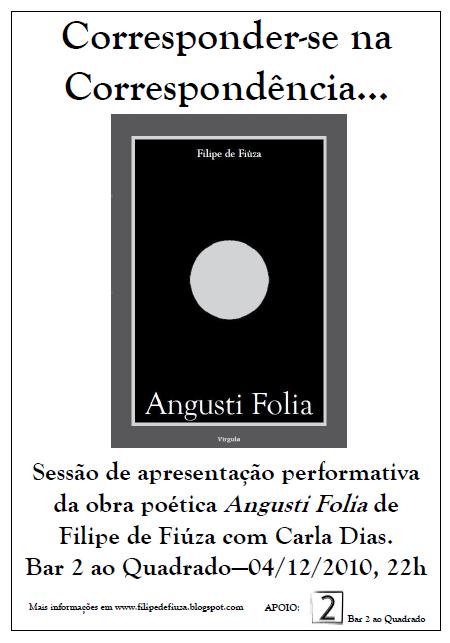 «Corresponder-se na Correspondência» é o nome da sessão de apresentação performativa da nova obra poética de Filipe de Fiúza intitulada Angusti Folia. O Bar 2 ao Quadrado em Sintra, habitual ponto de encontro de artistas, é o local onde no dia 4 de Dezembro de 2010 pelas 22h00 a professora e actriz Carla Dias guiará o público numa partilha de vida íntima pelo palco poético da vida.