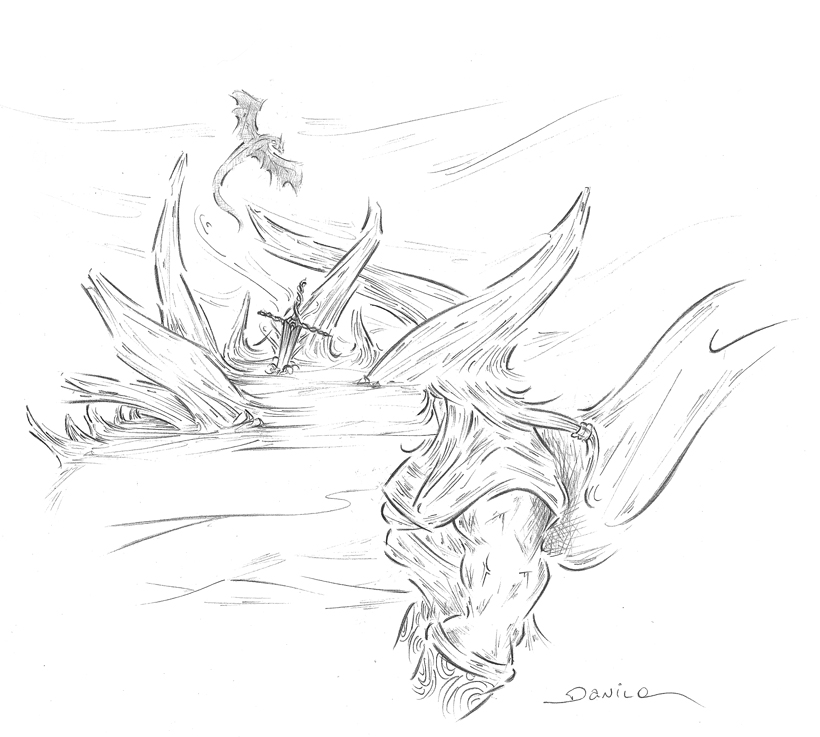 O mistério pairou no ar e como um homem de muita fé, absorveu aquelas palavras com muita sabedoria ao lembrar-se do estranho de outrora que havia lhe dito para não ter medo.Então, de olhos fixados no dragão, ele correu até o aço que não ofereceu resistencia alguma ao ser retirado.